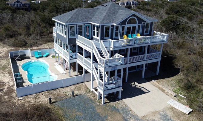 500 feet will take you to the 4x4 beach or to Carova's own public park. The peaceful surroundings are only the foundation for the serenity you will enjoy at Kaptain’s Treasure. Lounge around the huge private pool or in the 6 person hot tub while watching the kids splash in their very own private kiddie pool. Have a picnic in the outdoor dining or move indoors for some diversion in the game room with pool table, kitchenette with refrigerator and microwave as well as comfortable seating and television. Every bedroom and living room is connected to DISH and most of the tv's are also smart!