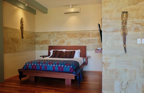 The Studio is a duplex unit just below a Joglo, with the same sized “footprint” but offset so that the studio terrace has equal portions of sun and shade. With a 30 square meter terrace to dine on, view the sunset, or just relax after a bath or shower, the Studio has all the amenities as the Joglo above, such as a king size bed, complete kitchen facilities, 2 showers, full stone bathtub, 40” TV, ethnic artworks, acacia desk and chair, full ocean view, floor to ceiling sliding glass doors……all surrounded by luxurious gardens that exude the sense of privacy we prize at Karuna. It has luxury finishing such as Javanese stone and hardwood flooring, marble sinks and countertops, crowned by 3.2 meter high ceilings, sadly no carved “tumpang sari”. For guests who have a third person in their party, an additional super twin bed (110 cm wide) can be provided.