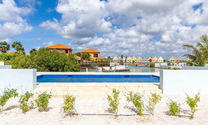 Kas Cocoloco-Lagoon is a wonderful, modern and brand new ground floor accommodation with a big pool direct in waterfront, shared by only 6 Villas, for a maximum of four guests. This little individual resort inside the bigger Water Villas Bonaire resort offers more place, luxury and privacy than other accommodations of the main resort. The condo is located on the water of the Laguna Marina, the manmade lagoon with direct access to the Caribbean Sea.