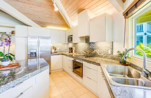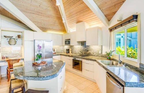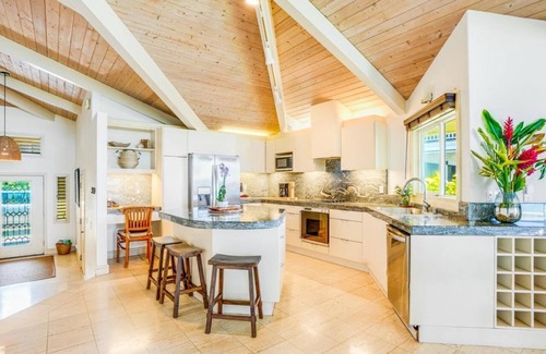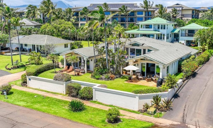 Sitting directly by the water, this palm-lined home is the perfect landing point for your next trip to Hawaii. Your stay comes with a free membership to the Poipu Beach Athletic Club, providing you an all-access pass to a resort-style pool, hot tub, sand-bottom area, and water slide for kids, as well as a fully-equipped gym facility fitted with cardio machines, weights, yoga studio, basketball courts, and tennis courts.