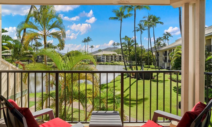 Kauai Beach Villas E-15 view the Freshwater Lagoon & Tropical Garden | Condo in Lihue