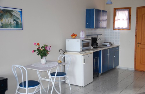 Kavos Psarou' is a delightful by the sea self-catering accommodation, (from season 2015 there is the possibility to have breakfast and meals at our accommodation from our snack bar) built under the rules of local architecture reminding old Zakynthian mansions. Accommodation is set in a big estate with a front of 260m to the sea, providing you a 'private' secluded beach. Built in a tranquil, refreshing, green, lush, Mediterranean, environment, you will find real relaxation and the authentic Greek hospitality of Biskinis family. 'Kavos Psarou' is surrounded by grass, flowers and olive trees. It is new and it offers rooms all with superb views of the sea from the large balconies. Kavos Psarou has nice studio the most spacious studio at Zakynthos island (32m2), biggest than many hotel rooms. Studio is open plan room with private bathroom and kitchen corner. Studio is suitable for 3 adults or 2 adults and 2 children, they have 2 single beds plus a sofa bed. There is also possibility for a folding bed, on request.