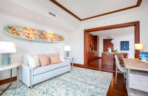 Anuenue is ideally positioned at the front edge of the resort, well away from any active construction areas. As one of the most unaffected villas at Montage Kapalua Bay, it offers uninterrupted tranquility, pristine ocean views, and a serene atmosphere that sets it apart during this transitional period. This stunning villa also features a private lawn, unique to this residence, where only guests of Anuenue can gather. Located just above the recently-renovated Beach Club pools, this villa is in the most ideal location at Montage Resort and Spa!