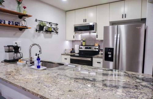 Make yourself at home with a spacious granite peninsula—great for cooking, dining, or just hanging out over drinks and conversation. Prefer a sit-down meal? The four-person dining table is perfect for enjoying takeout or something prepared in the fully stocked kitchen.