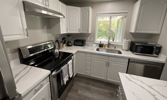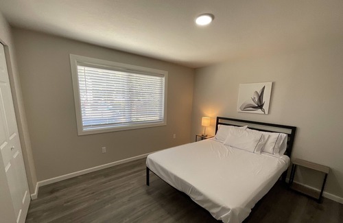 This upper level duplex has everything you need is on the same floor. There are three bedrooms with queen beds. The master bed room has a work desk, 1/2 bath and private balcony. There is an additional large bathroom and a laundry room. All our homes are furnished with fully functional kitchens with coffee bars to get you going in the morning. There is a designated parking spot in the driveway and there is plenty of additional parking on the street.