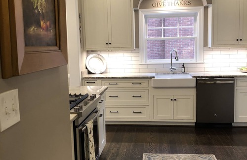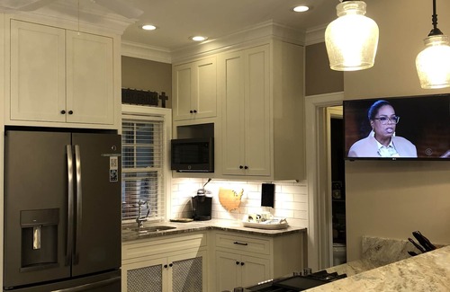 A circa 1935 newly-remodeled family home in the heart of the Highlands has a luxurious new kitchen, 4 levels of roomy comfort, and is convenient for all your Derby 3-day weekend activities. Living areas include a spacious living room with a large screen TV if you choose to watch the Derby inside, a combination beautiful dining room (which seats 6-8) and kitchen (with 3 bar stools for extra seating) with another TV, and a screened-in porch for more entertaining space. There are 4 bedrooms of which the master has a king size bed, 2 have queen-size beds and 1 full-size bed, all furnished with new sheets and pillows. 3 full baths with walk-in showers and an extra newly-remodeled half-bath complete the interior living areas. The master bath remodeling project was completed with gorgeous floors, marble countertop and a roomy glass shower. For the final touch, a spacious front porch offers 4 rocking chairs for enjoying the long weekend.
