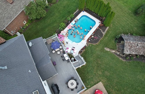 This large, stylish retreat is perfect for group trips or a family get away. Great heated pool. Tons of indoor and outdoor entertaining and dining space. Large deck and patio with ample seating for large groups. Fire Table. Covered outdoor seating area. Gas/charcoal grill. Four bedrooms including large master suite with whirlpool tub. 3.5 baths. Workout room. Bar area. Three floors of living space. Large yard. Ample off street and on street parking available.