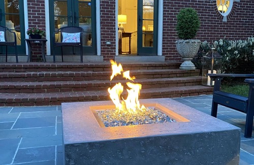 English Country Backyard with Brick Wall, Bluestone patio and gas fire pit