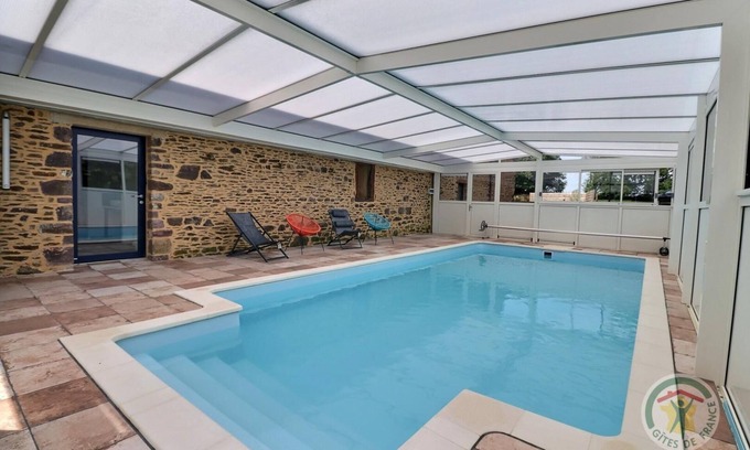 House arranged over 3 levels. On the ground floor: - a dining room with a kitchen (SENSEO coffee machine) - a large 92 m² living room (suitable for small receptions) with direct access to the private heated swimming pool (28°C) under a veranda (9m x 4m - depth 1.20m to 1.60m), open year-round, with a bathroom area (two sinks, a shower cubicle with a toilet, and a separate toilet) - a bedroom with a 160x200cm bed and its own shower room - a laundry area - a separate toilet On the first floor: - a bedroom with a 180x200cm bed that can be converted into two 90x200cm beds, an en-suite shower room, and a separate toilet - a bedroom with a 180x200cm bed, two 90x200cm bunk beds, an en-suite shower room, and a separate toilet Private On the 2nd floor: - One bedroom with four single beds (90x200 cm) - One bedroom with a double bed (160x200 cm) - A shower room and a toilet Outside: - A private courtyard with a lounge area - A shared garden with trees and flowers Located 17 km from Paimpont, this 15th-century manor house, listed as a Breton heritage site, welcomes you to a verdant setting on a large wooded property. Adjoining the owners' residence, the gîte offers spacious and well-appointed accommodations, including beautiful bedrooms with private bathrooms. The authentic local stone architecture with exposed beams and generous proportions, combined with contemporary décor in soft tones, lends a refined ambiance to this characterful house, which has retained its finest period features (monumental fireplaces, stair turret). A change of scenery and relaxation await you during your stay, perfect for a small family or group of friends. Just 7.5 km away, the Domaine de Tremelin offers a range of sporting and leisure activities: swimming and water sports on its lake (kayaking, canoeing, pedal boats), mini-golf, an equestrian center, and a treetop adventure course.