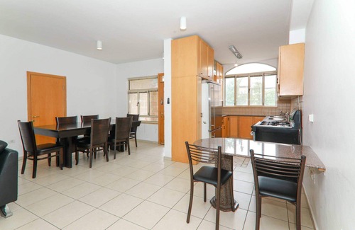This duplex apartment has four bedrooms and two renovated bathrooms, and can well accommodate up to eight guests. Plenty of light shines into a spacious living room, complete with a comfortable sitting area and entertainment center, and a roomy dining space. There is a second lounge upstairs, with doors leading onto a balcony surrounded by lush greenery and a rooftop view of the area. The cozy bedrooms upstairs have large closets, allowing you to unpack and settle in. A country style kitchen is equipped with utensils and appliances, as well as a breakfast nook. Arched windows accent the entire apartment, granting a feel of traditional Jerusalem to the modern dwelling.