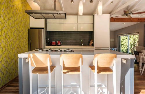 This house is set across different levels so guests should take care when using the interior steps between the different living areas and bathroom.Due to the unique layout of the house, the 2 bedrooms are accessed through the bathroom from the main living area. Please also note that there is no door separating the bathroom from the hallway that leads to the bedrooms.Please note that the separate sleepout is not available for guest use.The shallow steps leading from the driveway to the front deck do not have handrails. All guests should take care when walking up the driveway and to prevent falls.Please note a bond may be charged at certain times of the year. One of our team members will contact you if this is required for your booking.