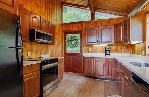 Inside, knotty pine accents create a warm, rustic atmosphere throughout. A galley kitchen welcomes you and sets the stage for memorable family meals—made even better with fresh, local finds from the Windmill Farm Market. In the great room, wall-to-wall windows frame a sweeping panoramic view of the lake, so you can enjoy the scenery rain or shine. The main level also features two private bedrooms, each with a queen bed.