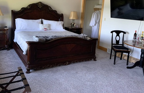 The Balcony Suite is located on the second floor lakeside and has a private bath and private balcony overlooking the water. There's a king sized bed, smart tv, and an in-room wet bar. The bathroom is complete with a walk in shower/full body spray system and basic toiletries.