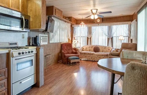 Relax in the sun at this comfortable park model with king bed in a wonderful resort. One guest must be 55+. Enjoy amenities such as two pools, two hot tubs, 24hr gym, billiards, shuffleboard, and a library.