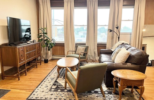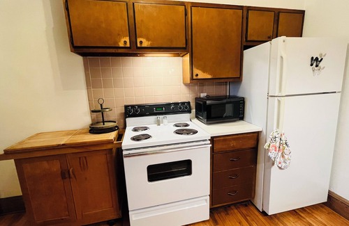 30 day+ stays only. Sleeps up to 4 with King bed in bedroom and queen sofa bed (Sleep Number brand) in the large living space. Smart TV and fast wifi, dedicated desk and work area, newly remodeled bathroom (and HVAC and electric). Fully stocked kitchen. 0.4 mi to NRMC hospital and ATSU, Truman State University. Even closer to the movie theatre, several restaurants, and shops! Up 26 steps. Laundry on the same floor down the hall. Up 26 steps.