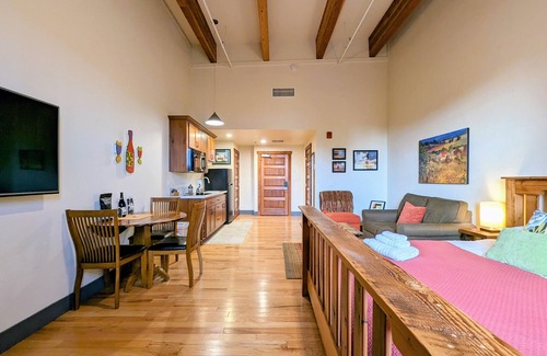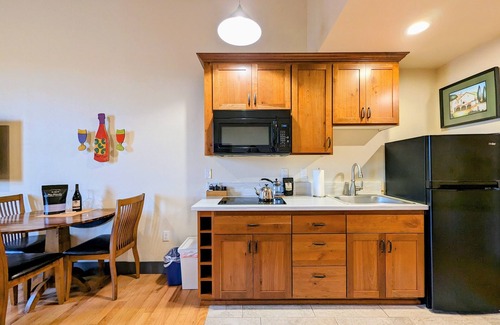 Located in the newly renovated century-old Masonic Lodge building, the Nekia Flat is a studio-style room with a king-size bed and a kitchenette. The love seat converts to a comfortable single bed, and a rollaway can be added on request, so this room will accommodate a small family comfortably. The jazzy color scheme in Nekia’s furnishings will enliven your visit. The kitchen includes a full-size refrigerator, induction stovetop, microwave, and a BBQ grill on the patio ensuring that you will have everything you need to prepare meals. A large, operable window in the exposed brick wall on the south will brighten the room; you can pull down a shade for peaceful darkness. Nekia is known for being the quietest suite at the Amity Flats, so for those who love to sleep in on vacation will love this Flat!