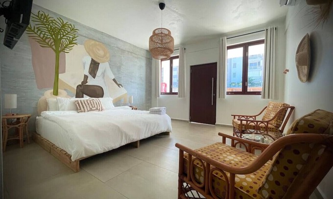 Corcega Beachfront Suites are tastefully decorated with the discerning traveler in mind, featuring plush bedding and stylish decor. It's the perfect choice for those who appreciate the finer things in life and is equipped with solar panels.