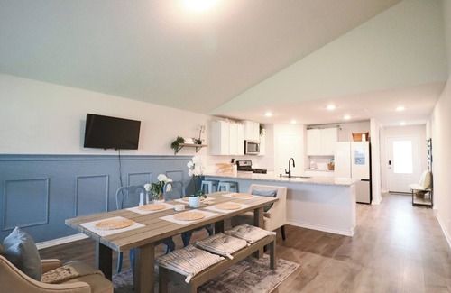 Inside the home, tall ceilings sit atop brightly lit spaces expertly curated with contemporary furnishings and tasteful décor, designed for connectivity and entertainment. A plush, L-shaped sofa in the living room will provide relief for your feet after long days exploring as you binge episodes of all your favorite shows on the smart TV. The fully equipped kitchen showcases stainless steel appliances, glossy granite countertops, and sleek white cabinetry stocked with all the comforts of home. Gather together for formal dining at the table with seating for 6 or snag a high-top stool at the counter for more quick and casual bites. Should you need to make a private phone call or catch up on those pesky emails while away, the dedicated office provides a quiet space to focus on the task at hand.