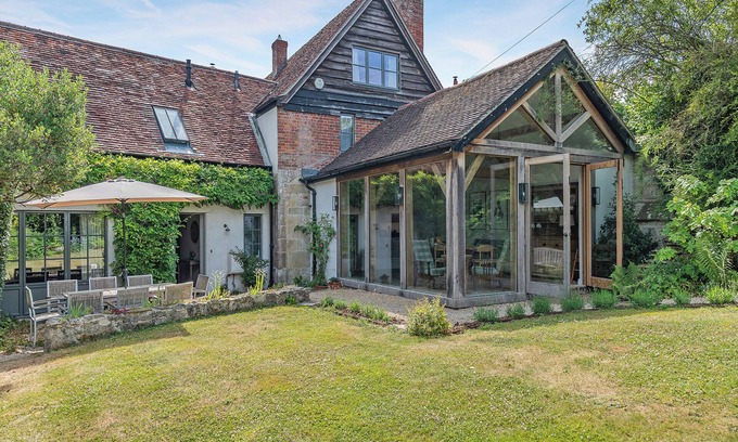 At the centre of the property lies a stunning glass-fronted dining room, designed to capture panoramic views of the surrounding garden and lush greenery. This space is flooded with natural light throughout the day, offering a serene setting for meals or quiet reflection. Adjacent to the dining area is a spacious, modern kitchen fitted with top-of-the-line appliances, catering to culinary enthusiasts who love to cook and entertain. The kitchen’s sleek design harmonises beautifully with the home’s rustic features, striking a balance between elegance and homeliness. Inside, the interiors are enhanced by exposed oak beams that add warmth and character to every room. These traditional touches contrast perfectly with the home’s modern amenities, ensuring a cosy yet sophisticated ambiance. The living area is anchored by a central wood burner, which serves as a charming focal point during cooler evenings, inviting guests to gather around and unwind. Each of the four bedrooms has been thoughtfully designed as a restful sanctuary, with plush furnishings and calming décor that guarantee a peaceful night’s sleep and a memorable stay.