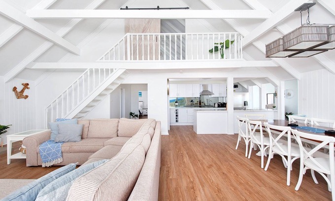 From the minute you drive up and see the Hamptons style exterior of this beachfront holiday home you will be blown away. On entry level you will find the perfect parents retreat complete with queen size bed, lounge area, a desk (for those who can't escape work) a huge TV and stunning bathroom and laundry. Venture upstairs for a light filled reading nook with views out to the ocean and even a range of books for you to enjoy.