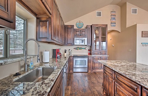 Just across the way, the fully equipped kitchen is outfitted with stainless steel appliances, granite counters, and a kitchen island. Grab a refreshing beverage out of the massive refrigerator before preparing a mouthwatering meal for the group.
