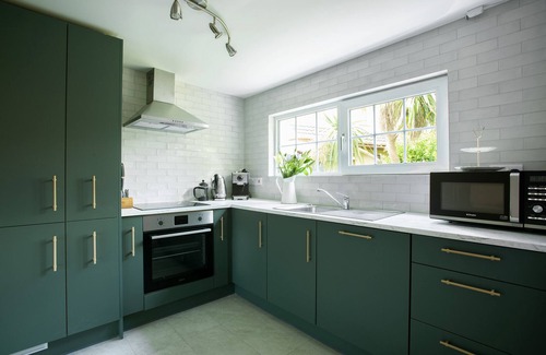 Meander through a rounded arch from the dining room, and a glorious surprise awaits in the chic design choices of this newly renovated kitchen, with a feature wall in a restful lilac shade complementing the deep green units with brass handles, and marble effect countertops; the overall effect is delightful.