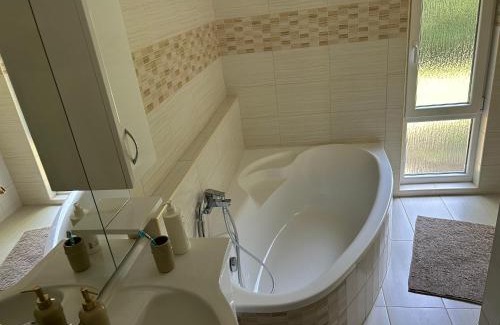 Offering free bikes, Kisvirág Vendégház provides accommodations in Balatonvilágos. This property offers access to a patio, free private parking, and free Wifi. Bella Stables and Animal Park is 8.4 miles from the vacation home and Bebo Aquapark is 8.9 miles away. Providing a terrace and garden views, the vacation home includes 2 bedrooms, a living room, cable flat-screen TV, an equipped kitchen, and 1 bathroom with a bath. Towels and bed linen are provided in the vacation home. The property has an outdoor dining area. Guests can also relax in the garden. Tihany Abbey is 30 miles from the vacation home, while Museum of Minerals is 12 miles away.