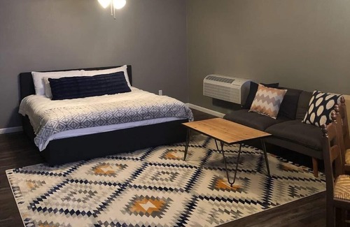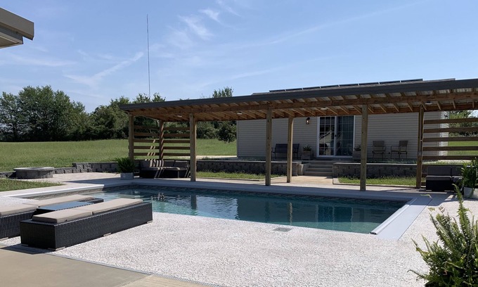 Klaver Cottage is a studio style space for travelers to rent located just outside of Joplin, Missouri. At Klaver Cottage you will find a king size bed and convertible sofa in a studio space conntected to the fully equipped kitchenette and bar area with a large flat screen TV. The spacious bathroom includes a 48” shower. During the summer months guests have access to the pool and outside space.