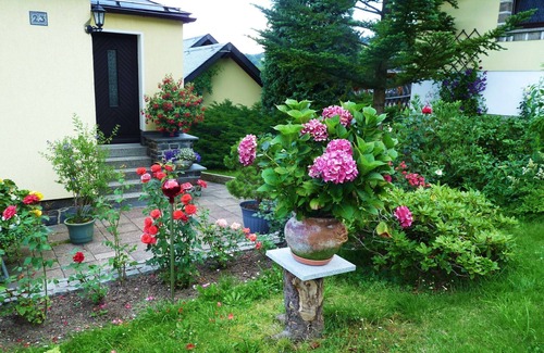 Our cozy holiday home for 2-6 people on the Aschberg at a height of approx. 800 m with a wonderful panoramic view in a large well-tended property with sandpit and swing for your little ones is ideal for relaxing and relaxing on a large terrace with camping furniture and a barbecue. Klingenthal is a well-known music and winter sports resort in the southwest of Saxony in the Vogtland region. Klingenthal has a lot to offer all year round - from winter sports, active or passive as a spectator at the most modern ski jump in Europe, to wonderful hiking trails and various music festivals every year. These include the music days in early May and the harmonica festival in September. There are many attractive sights and many beautiful hiking trails in the area. On my homepage under you can see more about my beautiful 4-star hotel.