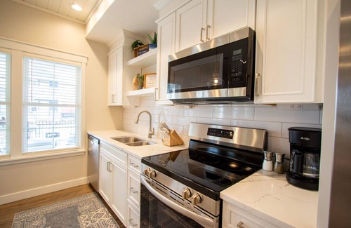 As you walk in from the welcoming covered, wrap-around porch, you are greeted with an airy, fully-furnished, open-concept living space that features a beautiful, well-equipped kitchen which has everything you need from making a fresh morning cup of coffee to a tasty home-cooked meal. The living room is the perfect spot to put your feet up and relax after a long day on the lake. You can flip on the Smart TV, sign in to your streaming account and catch up on your favorite shows or movies. We have also provided you with a variety of games that will keep you entertained even on those rainy afternoons! Continue through the main level, you'll find the master bedroom with a queen bed with a Helix Luxe mattress and a full bathroom with a walk-in shower.