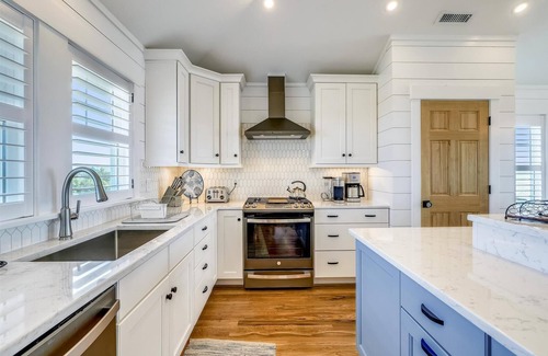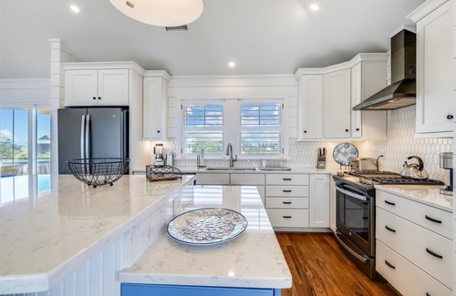 Unleash your inner chef in Knot for Sail's immaculate kitchen, where modern design seamlessly blends with functional elegance. Bright, white cabinetry contrasts beautifully with the gentle blue tones of the island, while the luxurious marble countertops gleam under the soft overhead lights. Every detail, from the honeycomb tile backsplash to the state-of-the-art appliances, has been curated for those who delight in culinary endeavors. Large windows flood the space with natural sunlight, making meal preparation a joy, and the charming nautical touches remind you that the ocean's bounty is just steps away. Here, every meal becomes a memorable experience, surrounded by tasteful decor and the promise of seaside adventures.