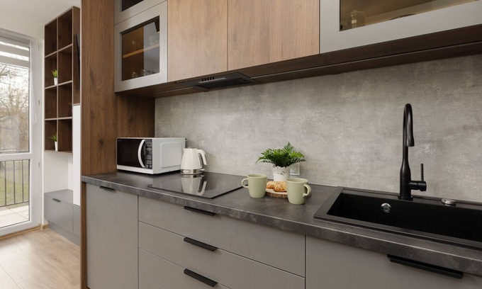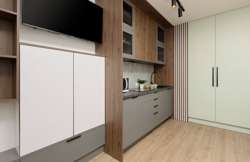 This cozy 20.2 m² apartment can accommodate 2 people. Perfect for couples or solo trips! It consists of a living room with a kitchenette, and a bathroom with a shower. The interior design of the apartment is very cozy and homely, personalized by the finishing touches of subtle decorations and stylish furniture. There’s also a balcony with two chairs, where you can relax and enjoy your morning cup of tea or coffee in fresh air. The apartment is equipped with a flat-screen SmartTV (+ cable television), and free Wi-Fi network. A wide range of bathroom and kitchen amenities (including a washing machine and ironing facilities) caters to our guests’ needs during the trip. The accommodation is a perfect choice for anyone who values comfort and functionality, but also the aesthetics. For an easy beginning of every stay, complimentary toiletries, bed linen, and towels are provided.