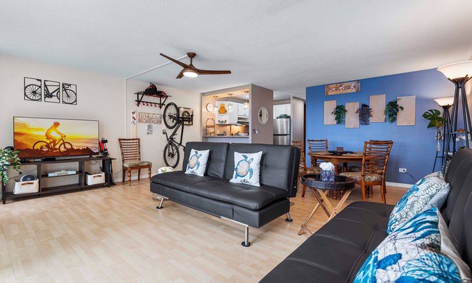 Welcome to your perfect getaway at Kona Ali’i, located in the vibrant heart of Kona town. This newly furnished 1-bedroom, 2-full bathrooms (yes, 2 full bathrooms!) corner unit on the 4th floor offers a blend of comfort and convenience, ideal for both relaxation and exploration. The bedroom features a cozy king-sized bed and its own private bathroom, providing a serene retreat after a day of adventure. An additional guest full bathroom along with two double sleeper sofas in the living space adds extra convenience for visitors, easily accommodating a family of four or 4 adults.