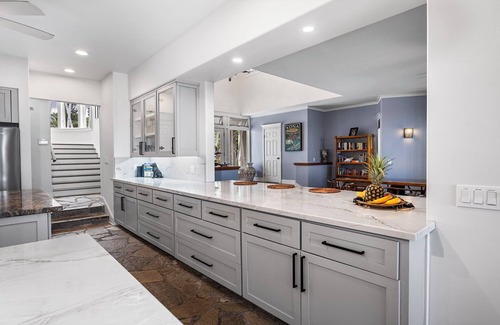 Kona Blue’s renovated kitchen is equipped for effortless cooking and entertaining. A large center island, professional-grade appliances, and abundant counter space provide everything needed to prepare meals together. There is also a casual eat-in area, ideal for morning Kona coffee or quick snacks between adventures.