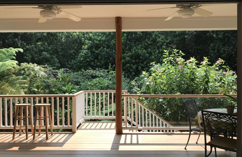 The large sunny living room extends onto your large private lanai through 16' sliding glass doors overlooking the lush gardens & greenbelt. There is a gas BBQ, and dining table with 4 chairs on the lanai. Watch the native birds and the occasional wild pigs stroll by!