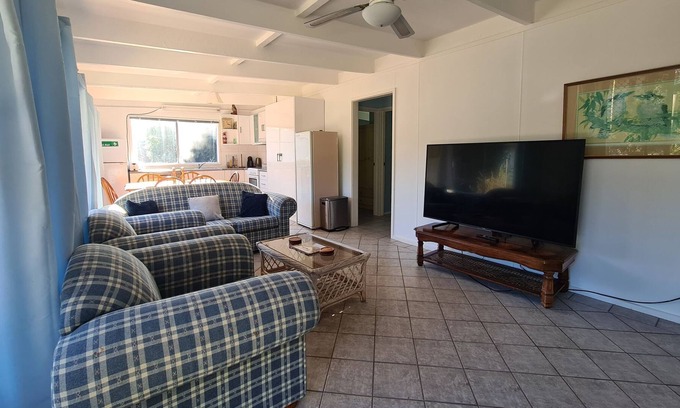 Walk inside to a open living area with lounge, TV, fireplace, kitchen/dining, leading to 4 bedrooms (3 queens, 2 bunks) & 1 bathroom, the property can hold 10 guest without breaking the bank 😊