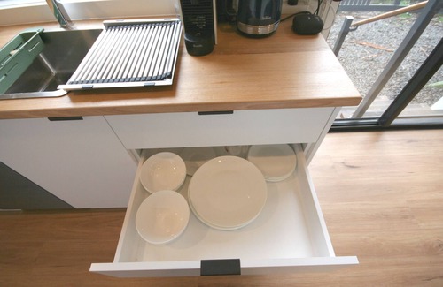 This brand new locally designed and built Tiny House is equipped with a kitchen featuring electric oven, induction cooktop, dishwasher and coffee machine.