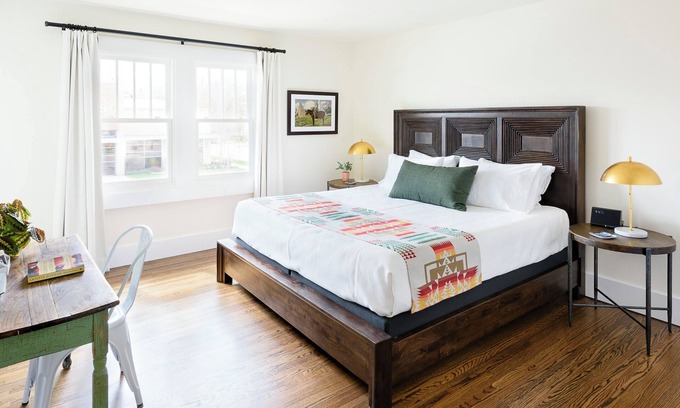 Geometric inspired design. The Kootenai has vibrant patterns and great light from the two south facing windows. This king bed suite, with private luxury bathroom is located up one flight of stairs or a quick elevator ride to the 2nd floor and can sleep up to 2 people (Adults + Children). There is a common room and kitchen for all 2nd floor guests to utilize. Room information can be found above the light switch near the door.