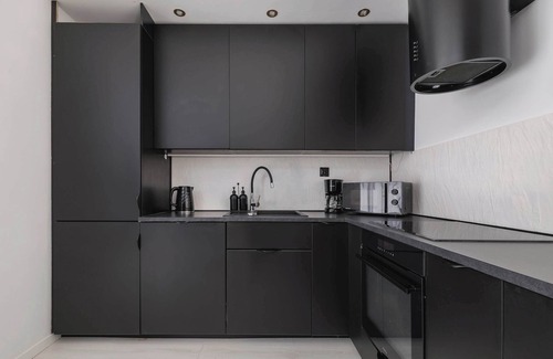 Induction hob, oven, dishwasher, microwave, fridge with freezer, drip coffee maker, electric kettle, set of dishes and kitchen utensils, table, chairs