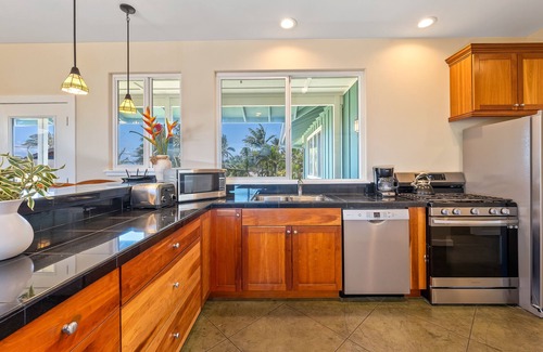 You can't beat the location: Kuau Makai is just a few steps away from Mama's Beach in a quaint and quiet neighborhood where it is still a pleasure to walk about. The house is on 2 levels: there are 2 bedrooms and 1 bathroom downstairs and another bedroom with bathroom attached upstairs. Gourmet kitchen, dining and living room are also upstairs and so is the lanai with a partial ocean view, perfect to sit in the evenings just shooting the breeze.