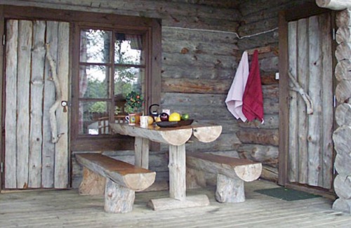 Log cabin 1981, renovated 2002, kitchen, lounge with fireplace, bedroom with bunk bed, bedroom with double bed, sauna, dressing room, washroom, open veranda. Portable charcoal BBQ grill. Coal