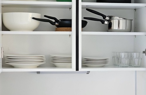 The kitchen is equipped with an oven, a stovetop, and a refrigerator, as well as a coffee maker, a microwave, and cookware. Bathroom amenities include towels and toilet paper. Other amenities include bed sheets, an ironing board, heating, and a dining table.
