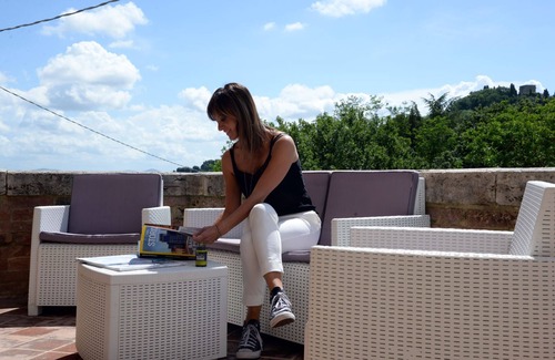 L'Albero is a renovated historic building, made of brick and stones in a classic Tuscan style. The garden includes a children's playground, and a sun terrace with views of the countryside at the borders between Tuscany and Umbria.