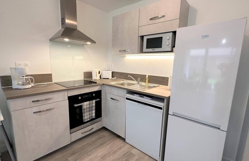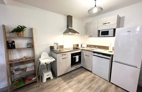We offer you a comfortable stopover in Dax for your romantic holiday, your spa treatment or your business trip. Located in a new 2023 residence in a quiet residential area, our apartment benefits from an ideal location, close to all shops and services and a 10-minute walk from the historic center of the city. The ramparts, the emblematic Fontaine Chaude, the cathedral, the Berges de l'Adour and the thermal establishments are close by and easily accessible on foot or by bike. Bright, functional, modern and new, our apartment guarantees you the level of comfort essential for a pleasant stay in all seasons. The residence is secured by a digital code. The apartment has a private parking space in the underground car park. A bicycle storage room is also available. Located on the ground floor, our apartment has a private covered terrace of 8m² with garden furniture and sun loungers. Fully furnished on one level, it is composed of: - an entrance with storage cupboard - a living room with lounge (TV, WIFI), dining room and open kitchen (ceramic hob, electric oven, extractor hood, fridge with freezer, microwave, dishwasher), - a bedroom: 1 bed 160x200 - a bathroom with shower - a separate toilet - a storeroom with washing machine. For your comfort, sheets, towels and household linen are included. The bed is made upon your arrival. Baby equipment (travel cot and high chair) is available. For everyone's comfort, we ask you not to smoke inside the apartment. For your spa treatment, a specific rate is offered.
