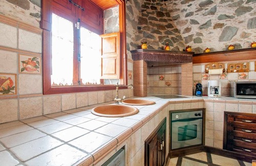 It has three bedrooms, two of them with double beds and all with windows to the outside, a large kitchen with typical Canarian design with direct access to the outside and a living room with fireplace and connected to the barbecue area, terrace and pool.