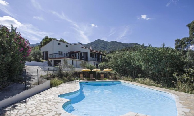 16 km from Argelès sur Mer: Very beautiful single-family house "La Belle Vue". In the resort, 500 m from the centre, on top of a hill, 16 km from the sea, 16 km from the beach, in the countryside. Private: natural state property 3'500 m2 (fenced), terraced garden, swimming pool kidney shaped (12 x 6 m, depth 120 - 220 cm, seasonal availability: 01.Jun. - 28.Sep.) with alarm system. Parking (for 2 cars) on the premises. Supermarket 7 km, shopping centre 7 km, bakery 7 km, 5 minute walk to the centre, railway station "Perpignan" 30 km, sandy beach "Argelès sur Mer" 16 km, diving center 16 km, bathing lake "St Jean Pla de Corts" 12 km. Sports harbour 16 km, marina 16 km, golf course (9 hole) 15 km, sailing school 16 km. Nearby attractions: Collioure 22 km, Espagne 16 km, Perpignan 30 km, Carcassonne 140 km, Argeles sur Mer 16 km, Banyuls sur Mer 30 km. Well-known lakes can easily be reached: Lac de Saint jean Pla de Corts 12 km, Lac de Villeneuve de la Raho 20 km. Hiking paths: Les Albères 15 km, Lac des Bouillouses 119 km, Pic du Canigou 94 km. Please note: car recommended. The owner does not accept any youth groups. Motorway 10 km from the property.