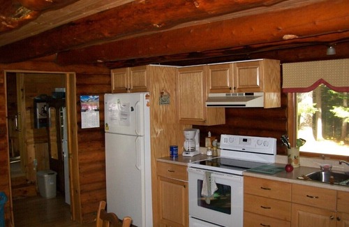 The main building is a post and beam log construction with full kitchen, dining area, rocking chair, a loft with double bed and private half bath.