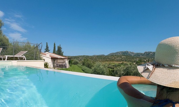 The panoramic swimming pool for exclusive use is surrounded by a large garden with olive and fruit trees.