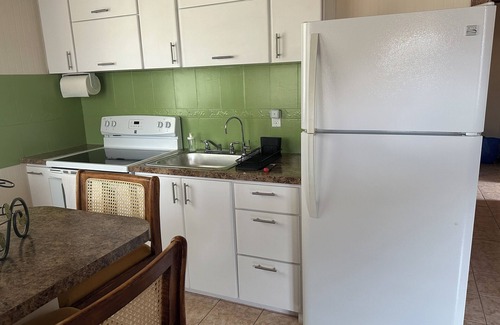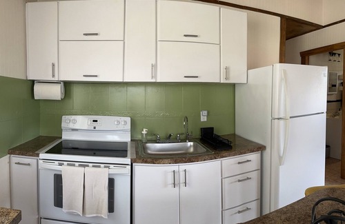 • Kitchen equipped with a stove, a refrigerator, coffee makers, a microwave oven