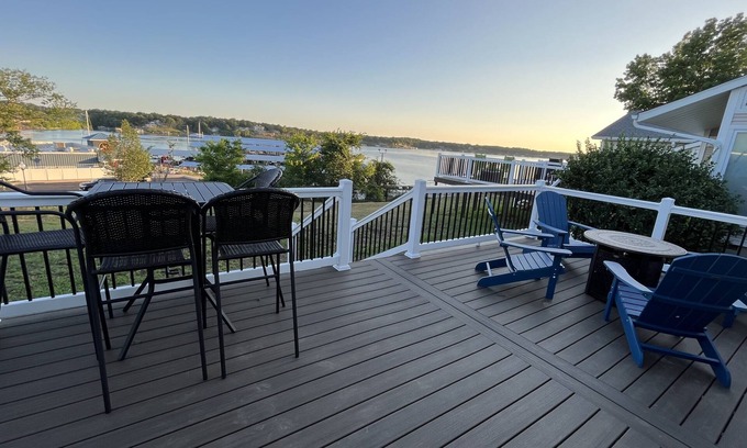This home is completely new and offers a gorgeous full kitchen with eating bar open to a comfortable living space with smart TV. Off the living area is a gorgeous new deck with pub table, new grill and firepit boasting spectacular views of the lake. All 3 overlook Honey Creek Marina.